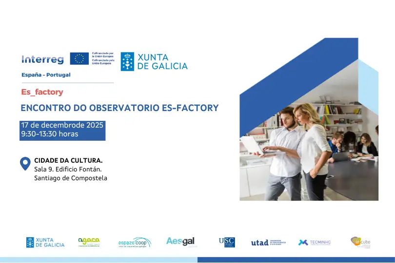 O Observatório ES-Factory realizará, no próximo 17 de dezembro, um encontro profissional na Cidade da Cultura da Galiza, em Santiago de Compostela, no âmbito da Atividade 6 do projeto POCTEP ES-Factory. A iniciativa procura fortalecer a cooperação entre a Galiza e o Norte de Portugal e gerar novo conhecimento técnico aplicado ao setor da economia social.