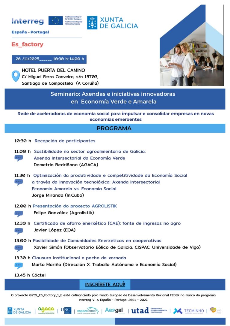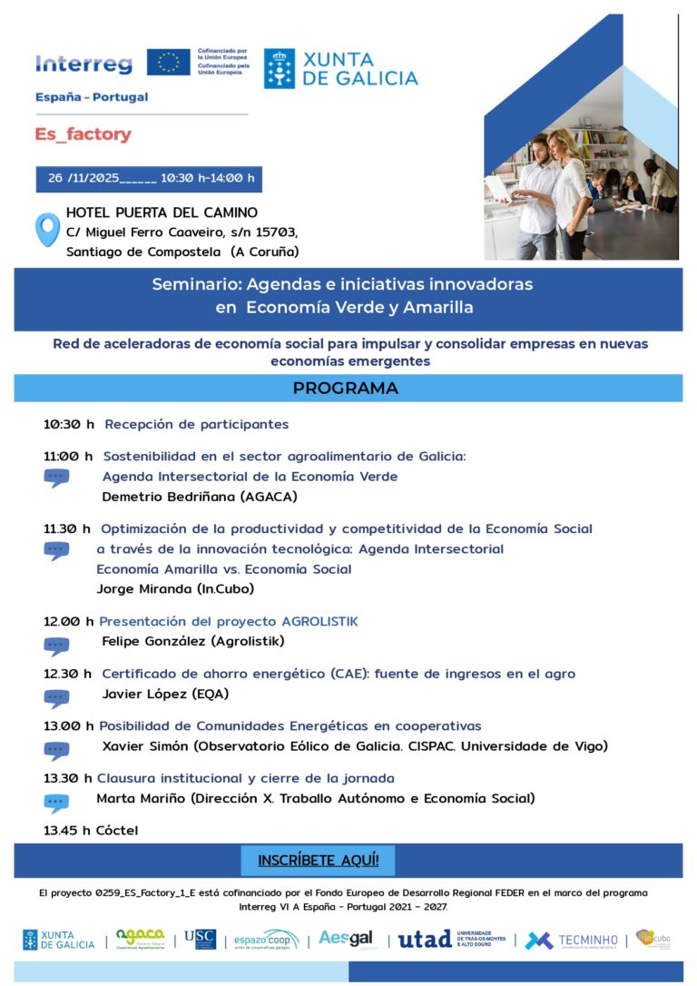 El proyecto ES-Factory, cofinanciado por el Fondo Europeo de Desarrollo Regional (FEDER) en el marco del programa Interreg VI A España-Portugal 2021-2027, celebrará el próximo 26 de noviembre de 2025 un seminario centrado en las oportunidades que ofrecen la Economía Verde y Amarilla para las empresas de economía social.